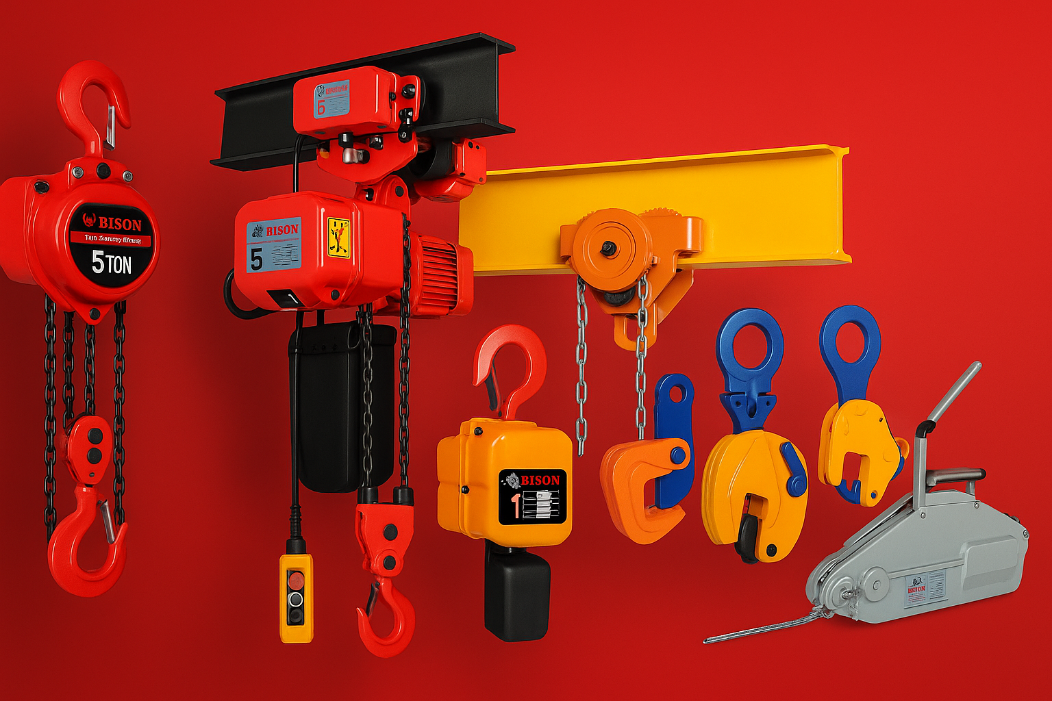 At PowerHoists.com, we proudly supply Bison Lifting Equipment — one of the most trusted names in industrial lifting, rigging, and hoisting solutions. Every Bison product is engineered for power and built for durability, meeting and exceeding ASME and OSHA safety standards to ensure superior performance and reliability on every lift.