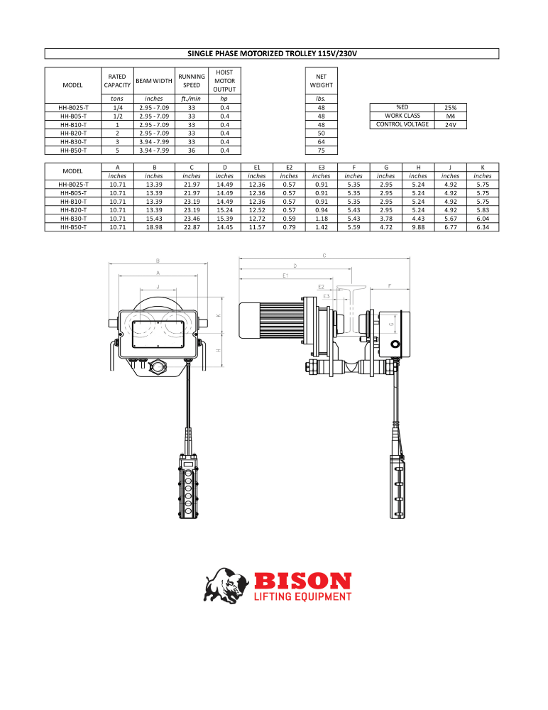 The Bison sinlge phase motorized trolleys are universal to all hoists. The trolley can be controlled indepently through its own pendant crontroller. Only hoists with 24V control can be wired into the motorized trolley to be operated all through one pendant.